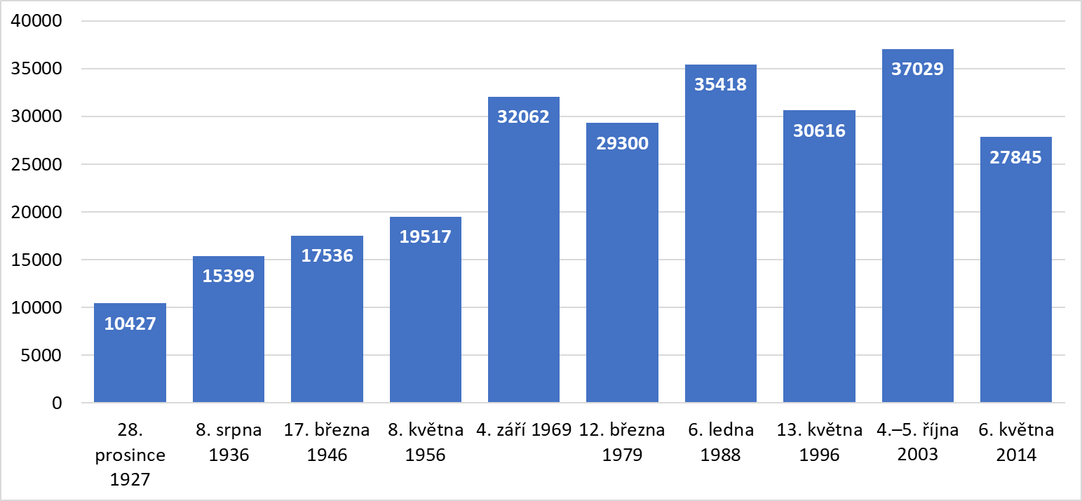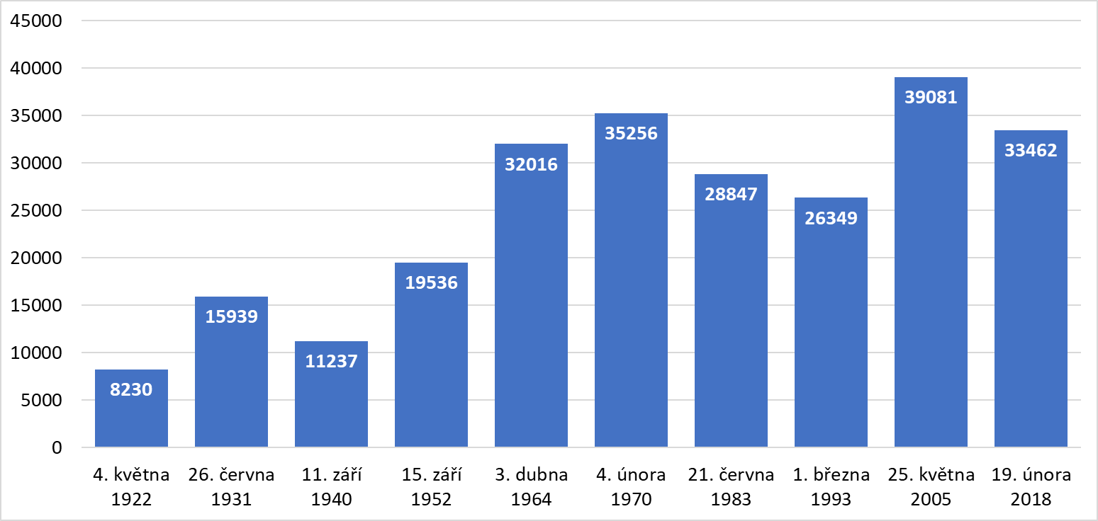 The OnomOs v2 corpus includes all the texts from the OnomOs v1 corpus, plus an additional issue from each five-year period that is not represented in the randomly selected issues of OnomOs v1. For example, if an issue of Rudé právo from March 12, 1979 was selected for the 1970s in the OnomOs v1 corpus, then OnomOs v2 adds another issue randomly selected from the 1970–1974 five-year period. Decades are defined as commonly referred to in colloquial usage of “-ties”; for example, the 1970s (“seventies”) are defined as the period from 1970 to 1979. Figure 2 illustrates the issues that were added to the OnomOs v2 corpus as compared to the OnomOs v1 corpus. Its total size of the corpus is 505,102 tokens.