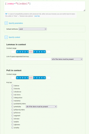 Every query can be further specified based on the context (the surrounding text) in which the search word or phrase can appear. The context menu, which is used for the specification of a query, can be found in the bottom section of the query form (it is hidden in the basic settings and it is necessary to activate it by clicking on Specify context).